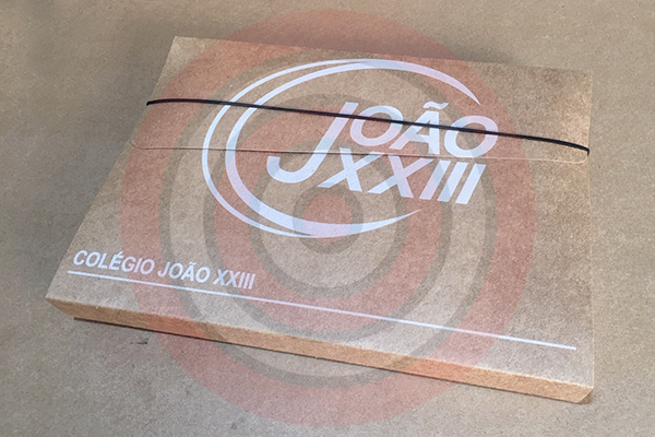 Pasta personalizada kraft, papel kraft 420grs e fechamento com elástico. Gravação personalizada em 1 cor já incluso, Formato final 33,6 x 24,3 x 3,4cm. Acabamento: faca e corte/vinco.