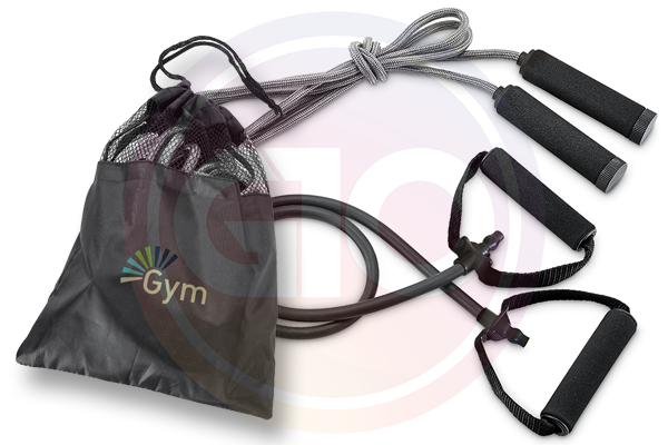 Conjunto de 4 Bandas Elás... Conjunto de 4 bandas elásticas de ginástica em bolsa de non-woven preta. Cada banda tem um nível de resistência diferente: Vermelha - forte; Amarela - médi...