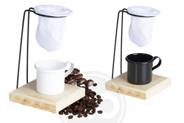 Kit Café 3 Peças contém: xícara de 120ml em metal, base de madeira com suporte para coador, e mini coador de café em tecido. Personalização inclusa.