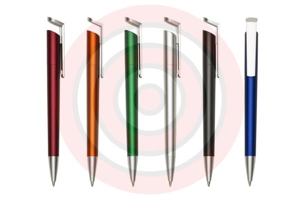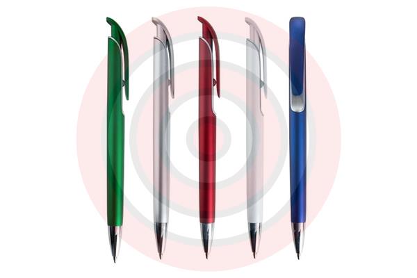Caneta plástica, design moderno, inovador, resistente, corpo nas cores: prata, verde, vermelho, preto e azul.