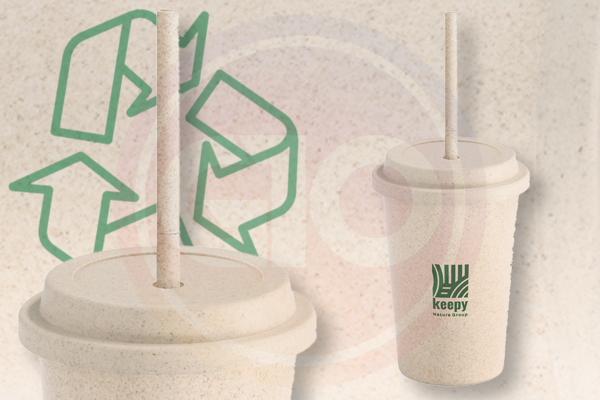 Copo fibra de arroz 350ml com tampa plástica de bocal. Gravação em 1 cor já incluso.