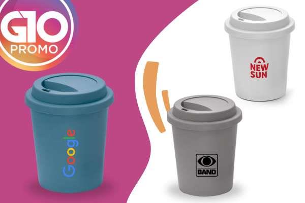Copo para café personalizado, copo plástico com capacidade de 350ml, tampa com bocal. Personalização em 1 cor já incluso.